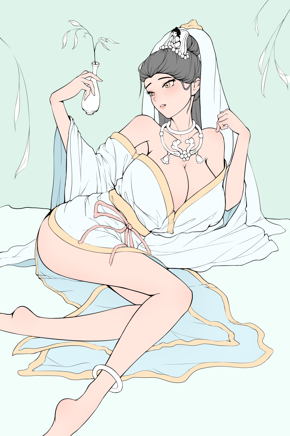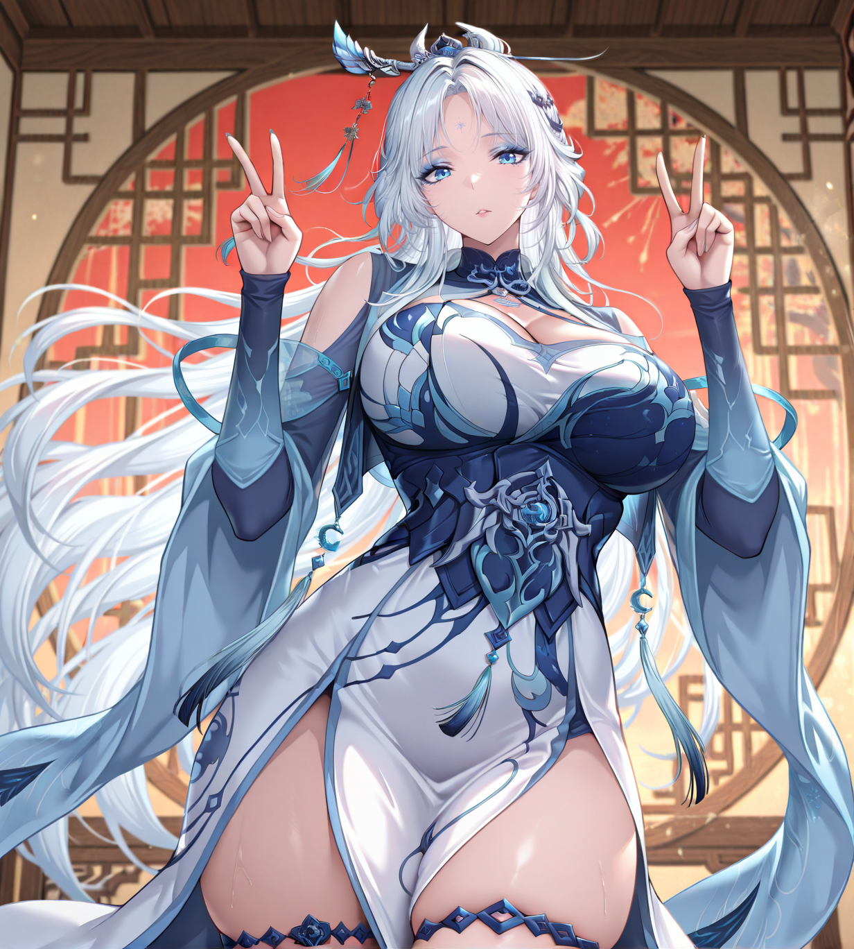 高挑性感,皮肤雪白,一头靓丽的银色长发柔顺地披在身后,脸上画着精致